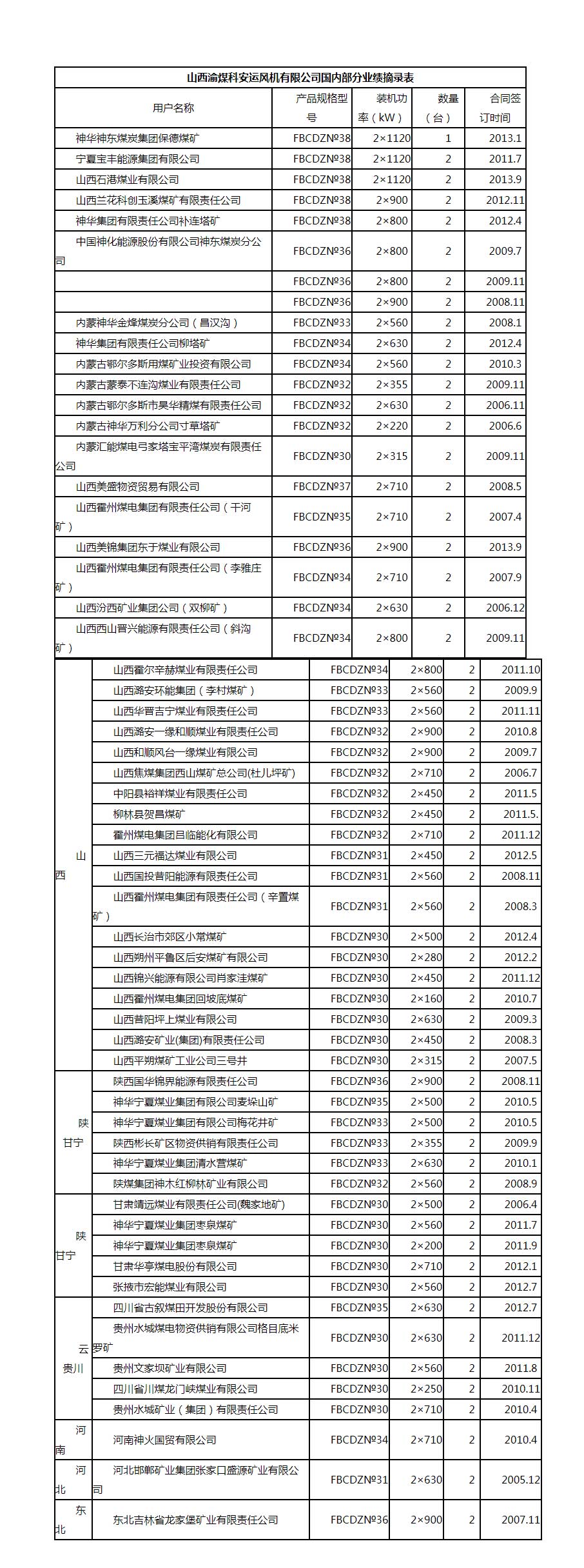 山西渝煤科安运风机有限公司国内部分业绩摘录表